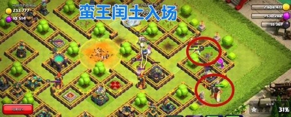 用狂暴法术覆盖天使女王来提升输出,让气球借助狂暴法术的增益突进,凭借气球仅攻击防御建筑的特性,精准点掉单头塔。
