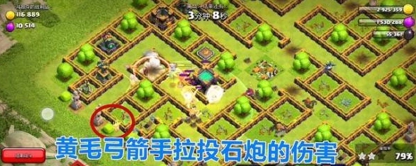 4、最后一个难点是位于8点钟方向的“投石炮”,我们可以用黄毛或弓箭手来吸引它的火力,注意不要一次性把兵都放完,而是逐个下兵,只要能吸引到投石炮的注意力就行。当然,如果前面几个点位的操作都能有效完成,大守护者的金身技能应该还能保留,这样一来,这个投石炮也就不会再是难题了。