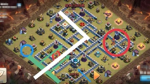 按蓝箭头方向,天女一路推进;篮圈处安排冰人、蛮王和训练营,绿色标识的是大部队。这个战术思路的优势在于,大部队直接冲击敌方大本营,就算没法达成三星胜利,也能确保拿到两星保底。