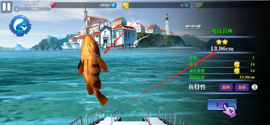 把鱼竿抛出去之后,要是有鱼上钩了,玩家就得点击收线按钮,另外还要留意屏幕中间的能量条,把钓鱼线的松紧度把控好。