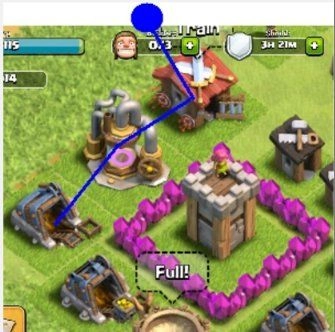如果敌人在蓝点位置部署弓箭手,其攻击优先级会依次是训练营、圣水采集器、金矿。需要留意的是,地图的四条边缘无法起到城墙的作用来阻挡敌人进攻。具体可参考下图: