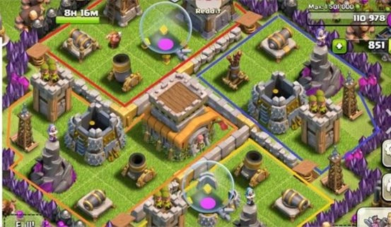 城墙能有效保护防御设施和资源,但单纯用城墙把防御建筑围起来,很难给对手造成实质性阻碍。不少新手常犯的一个问题是,让防御建筑直接暴露在敌方远程火力范围内——这种情况下,对手只需派出少量弓箭手或法师,就能轻松摧毁一座防御设施。具体可参考下图: