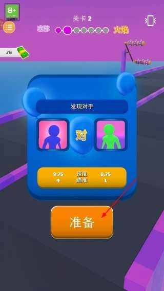 遇对手界面,查看双方属性,确认后点【准备】,进入气球射击对战。