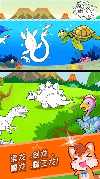 1、海量底图可供自由涂色绘画,图案丰富多样让人久玩不腻,其中囊括了各种各样的恐龙;