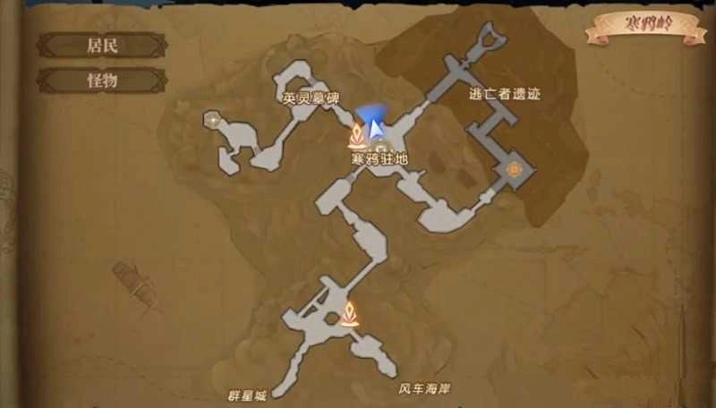 传送到寒妖岭地图后,能看到一群NPC,第一个秘闻的刷新点就在这里。接着打开地图,英灵墓碑附近有个守墓人NPC,这里是第二个秘闻的刷新位置。