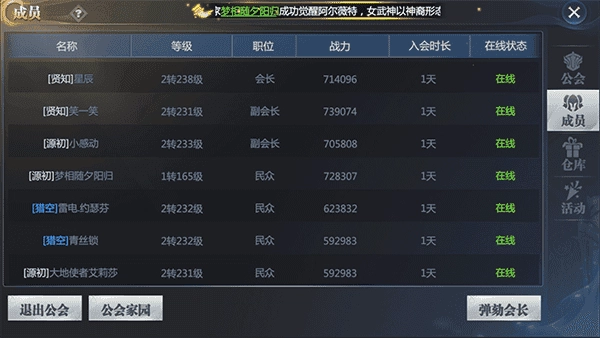 公会职位分为会长、副会长、精英与普通成员这几类。在这些职位中,会长、副会长以及精英具备清理公会仓库的权限。