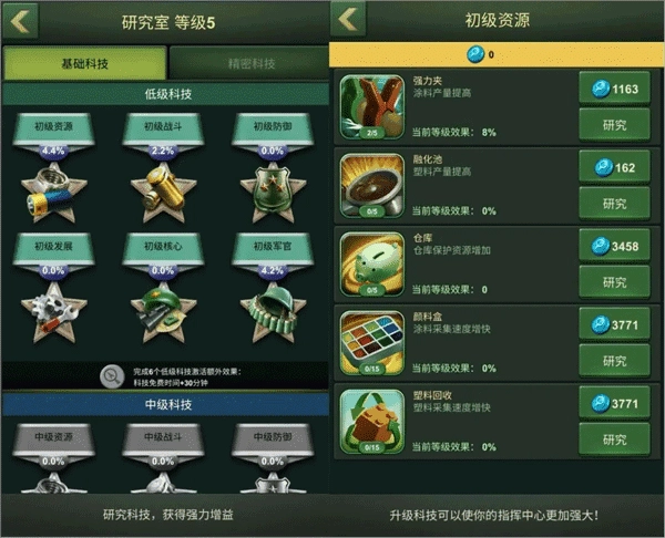 研究所的研究能永久性提升我们在生产、养成和战斗方面的全方位能力,因此新手期如何高效开展研究至关重要!前期我们主要聚焦于基础科技的提升,高效的加点方式需结合自身发展策略:若你倾向于通过战场采集与掠夺加速发展,可优先升级战斗和发展模块中的相关加成;若偏好通过发展城内经济来推进,则优先选择资源模块;此外,建议先将低级科技的六个模块全部升满,再着手研究下一级科技,这样能获得额外的科技研究时间加成,为后续的科技研究节省时间。