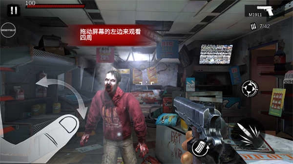 游戏采用横屏模式,左手滑动屏幕可拖动视角查看周围环境,右手则负责开枪、瞄准、换弹等操作。