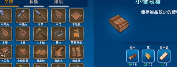 拿到松木板后,立刻做1-2个储物箱,把背包里的物品分类放进箱子里。游戏里背包的格子很关键,所以我们每次外出前,最好先把背包里的东西都存好,再去冒险。