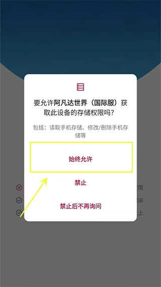 ①打开已安装好的游戏后会弹出安装器,此时会提示需要“储存权限”,请点击【始终允许】按钮。