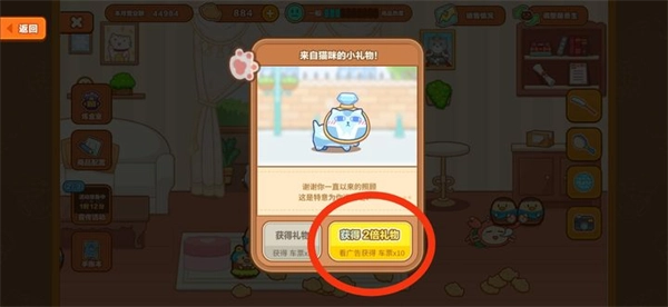 在旅馆界面中,每天都会随机出现不少猫猫互动标识,点击后能通过玩小游戏获取奖励。我个人觉得礼物标识的性价比是最高的(观看广告就能得到10张车票),要是大家有时间,建议可以多等几次刷新来领取礼物。