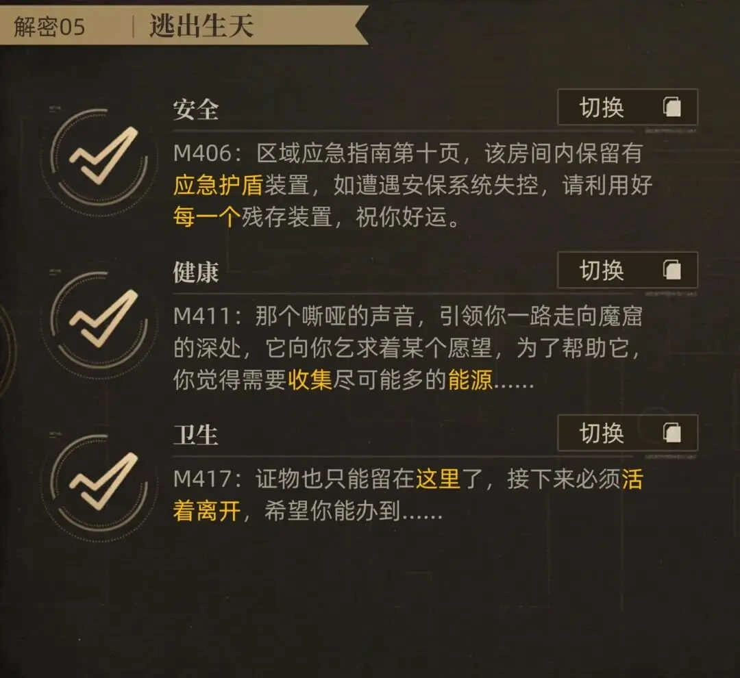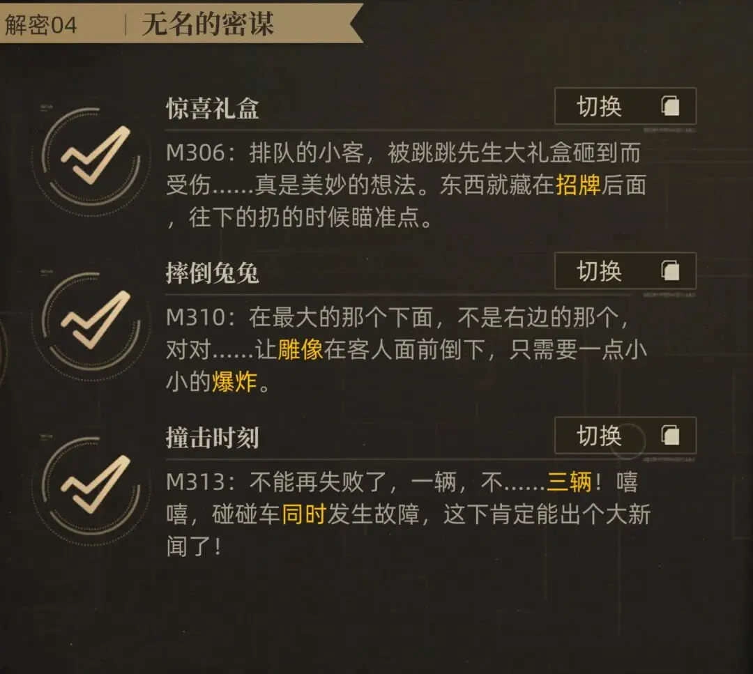咱们来汇总一下游戏常规剧情副本里0-4章的解密线索,希望能给大家提供一点小小的帮助。(要是遇到需要炸毁掩体的解密任务,初期赠送的5星角色格蕾茜可以优先考虑,毕竟培养她的资源是能返还的,所以短期内为了完成解密去培养她也不用心疼)