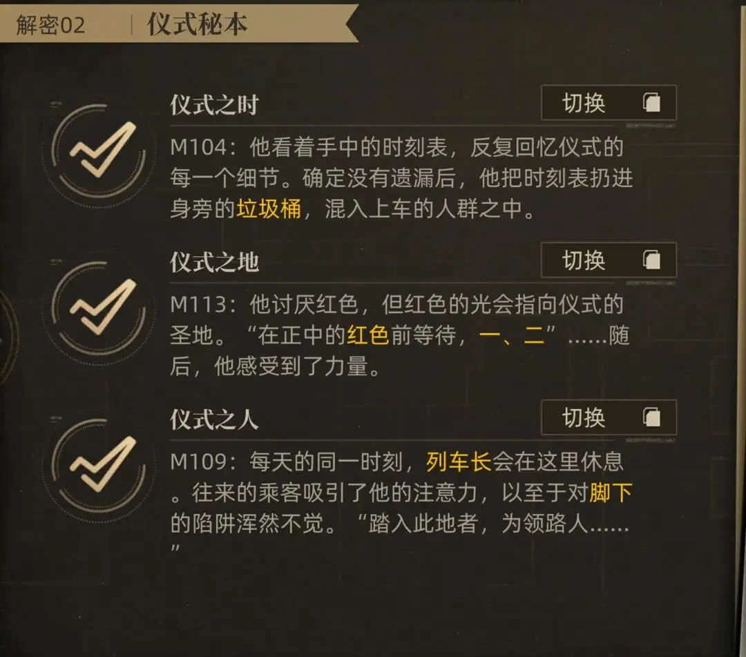 接下来是第一章的3个解密环节,对应的关卡分别是M104、M109和M113,关于具体的解锁要求和站位情况,详情如下: