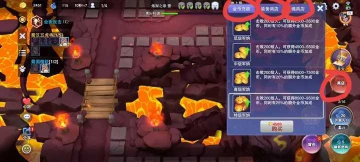 里面有金币充能,装备商店和魂商店三个不同商店。