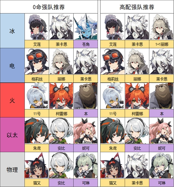 妮可:仅适配以太队,具备聚怪、破防、挂易伤、触发异常状态等功能,并且能量回复速度较快,不过在其他队伍中辅助效果欠佳。