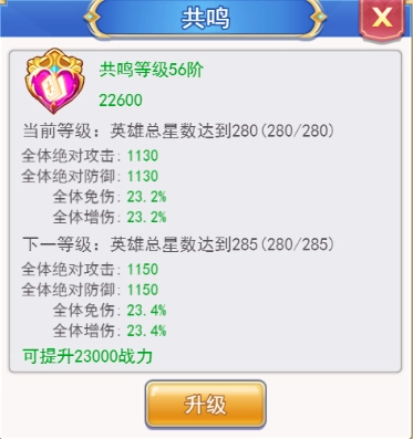 【星级共鸣】功能的核心是统计所有已激活英雄的星级情况,该功能的共鸣等级支持提升,每次升级都会进入新的星级要求阶段,对应的属性加成也会随之增长。需要注意的是,共鸣等级每累积满五级英雄星级才能升级一次。这个系统所提供的属性加成与基础属性有所不同,属于比较特殊的类型。感兴趣的玩家们可以自行探索研究,至于具体的战斗加成效果这里就不提前透露了。