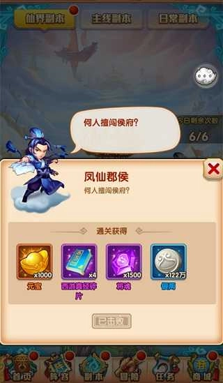 首次成功通过【仙界】关卡,能够领取通关宝箱,里面包含宝物精炼石、银两和元宝;之后再次挑战该关卡,可获取将魂。每日共有5次攻打关卡的机会,但每个关卡每天仅能攻打1次。
