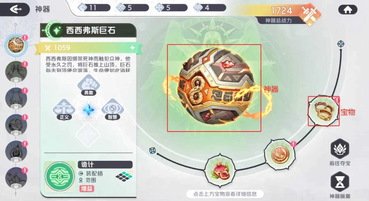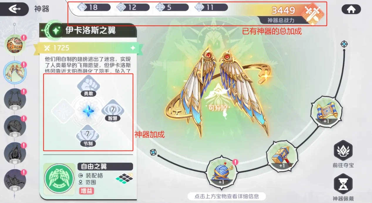 当收集齐一整套宝物来开启神器后,要把神器装配到主角身上,这样才能获取它所带来的额外增益效果。