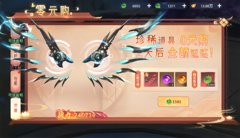 3、零元购活动:本次新增羽翼类道具,购买后两天即可全额返还灵玉,是提升战力的优先选择。