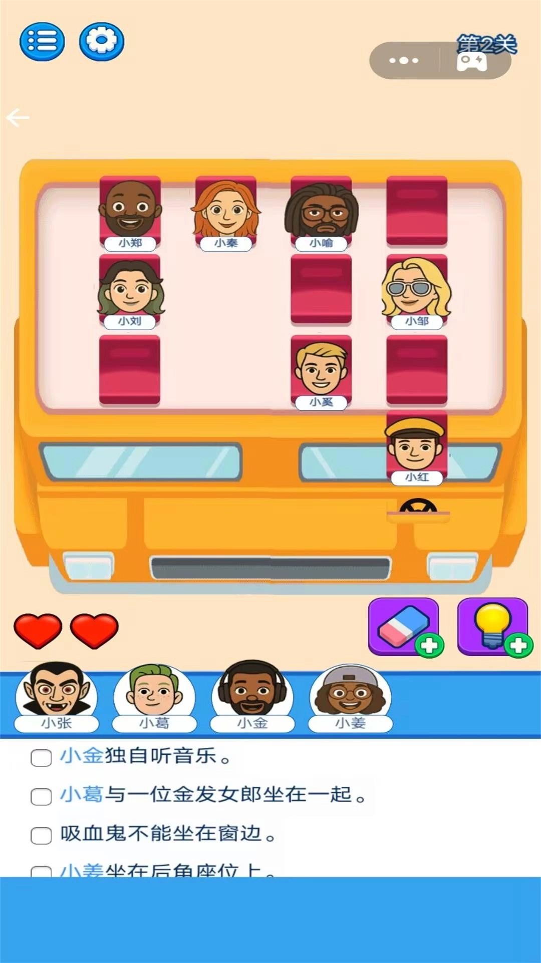 2、每个关卡会给出具体要求,玩家需通过拖拽或点击操作调整座位顺序,确保所有条件都满足。