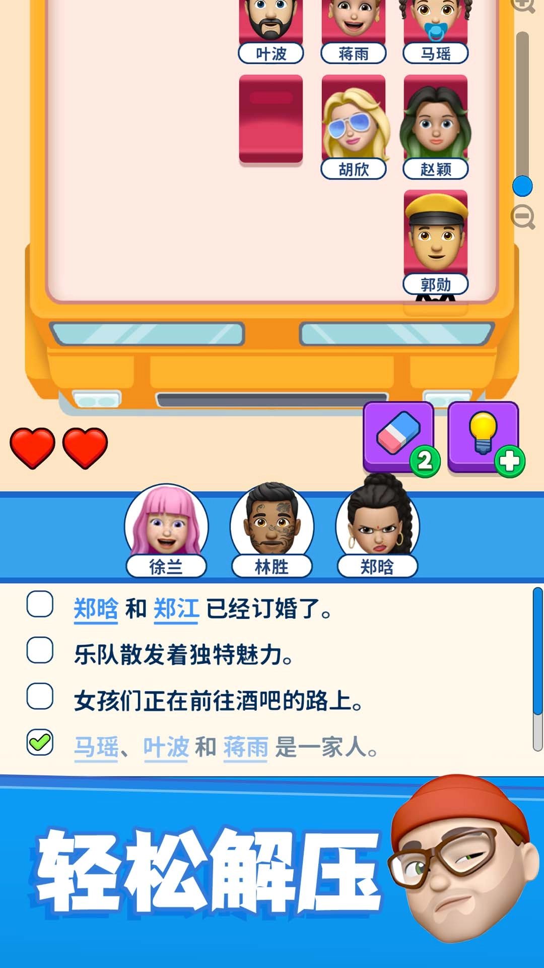 名侦探指南是一款充满趣味的座位大考验游戏,简直是把“烧脑”两个字写在了春游横幅上!每一次调整都像在解拼图,每一次成功安排都能收获满车欢笑,一串连环谜题!玩家们得瞪大眼睛看清每关的座位要求,在有限的车厢空间里排兵布阵,既要让温馨的小团体紧紧相依,又要巧妙避开小矛盾的“雷区”。