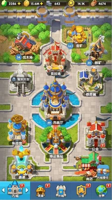 内城区域里首先有4个主要资源点:主城用于获取信赖,伐木场用来获取木头,金矿可获取金币,铁矿能获取铁块。关于升级顺序,建议按照主城→伐木场→铁矿→金矿的顺序来进行。
