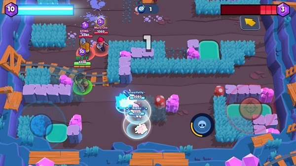 荒野乱斗采用竖版界面呈现战斗场景,和皇室战争一样,玩家以上帝视角进行游戏。与多数MOBA游戏不同的是,它没有复杂的技能组合,也没有进攻防御等提示,简化了大量繁琐操作。竖版左侧是虚拟摇杆,用于控制角色移动走位,玩家通过点击屏幕完成射击。当弹药命中敌方时,竖版右侧的能量槽会开始积蓄能量,能量攒满后骷髅头图标会被点亮,此时就能释放大招了。