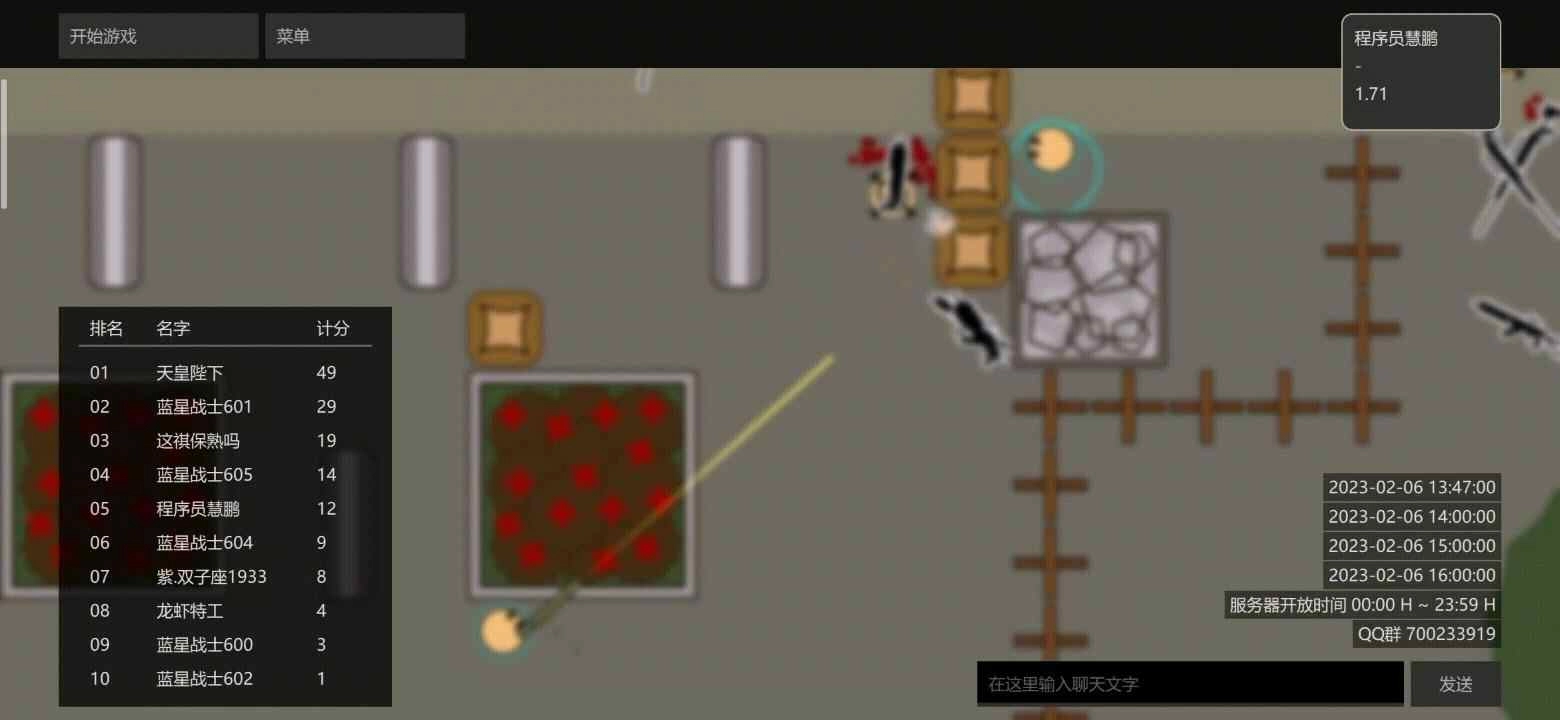 平台上那些3D枪战和真人画风早就把大家的眼睛看疲劳了。玩3D吃鸡时,甚至有人为了在跳伞时看清地面草丛里的对手,特意把显示效果调到最低。别费那劲了,我这可是抽象画风,人物和地面的区分度特别高,你能轻松锁定敌人位置,但能不能命中目标、敌人能不能靠掩体保命,就得看你走位够不够精准了。现在是混战模式,比的就是谁击杀数多,大厅里的排行榜按累计分数排序。要是战场上的敌人都躲在暗处不露头,你还能启动核弹把所有人都炸翻。