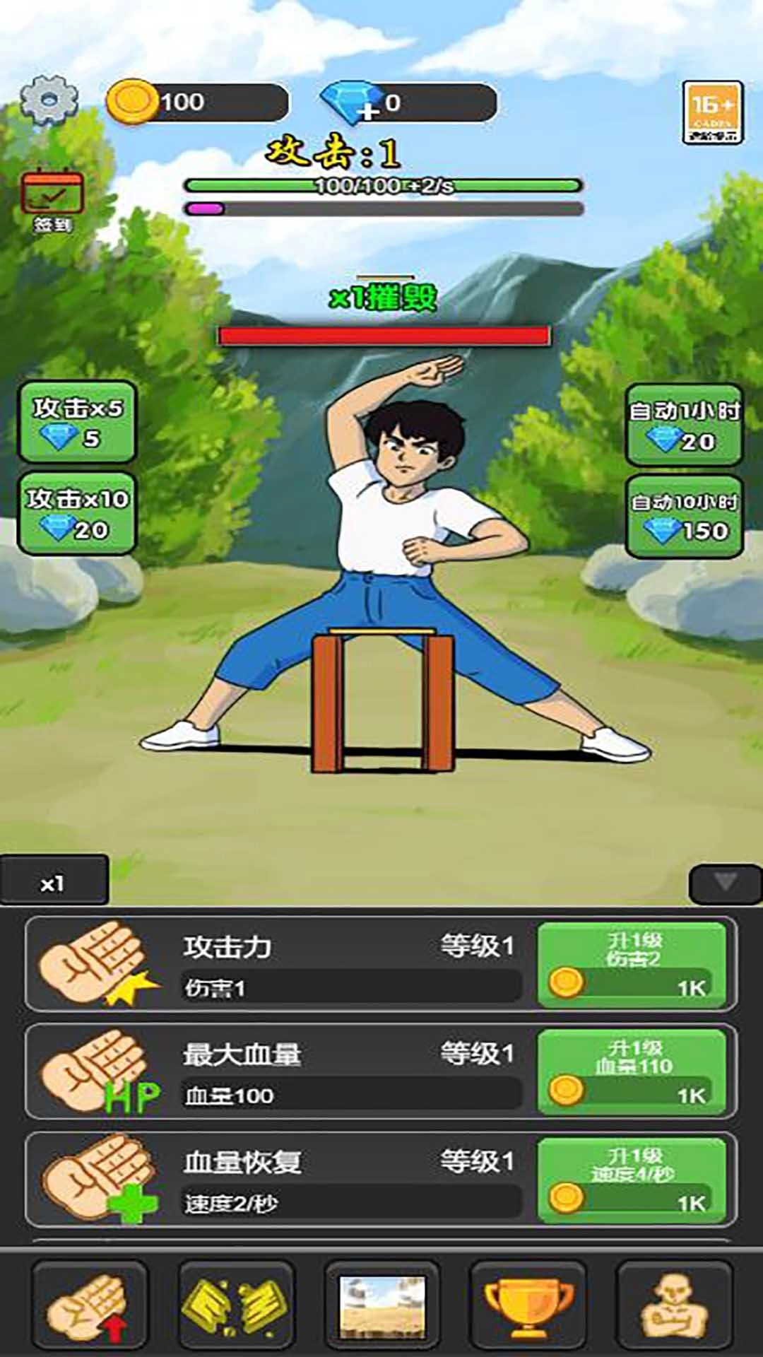 支持挂机战斗功能,即使处于离线状态,角色也能持续进行劈砖按压操作。