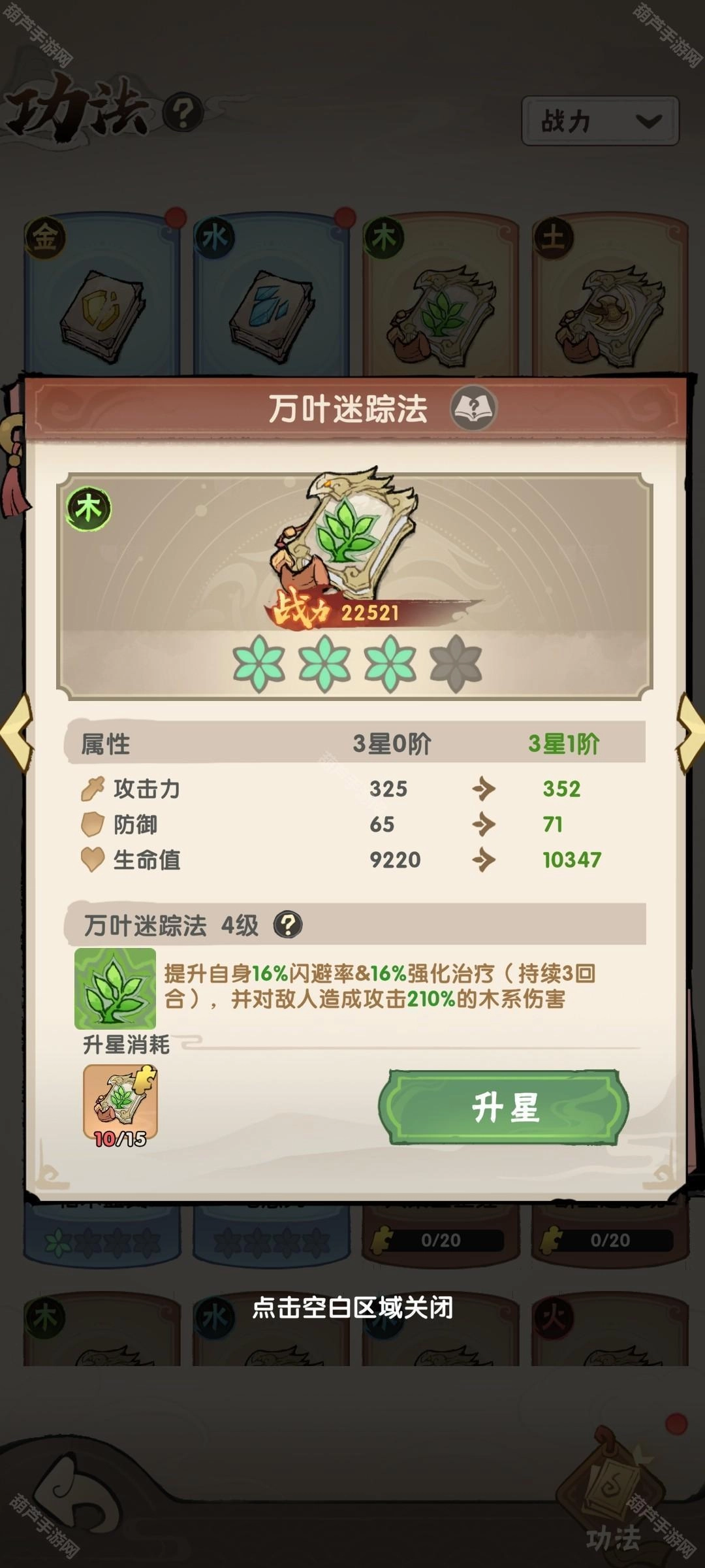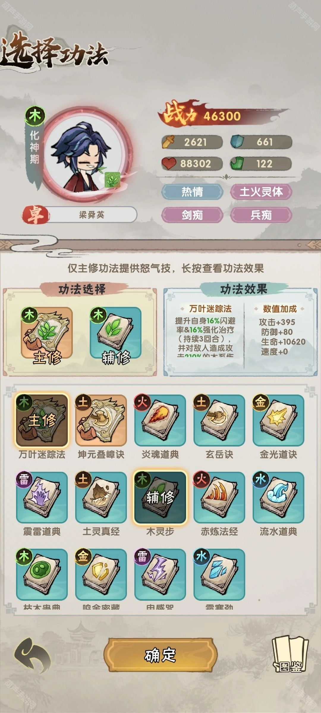 前期作战能力有限,续航是核心需求。可以先用木功法过渡——木系在竞技场和推塔方面表现较弱,前期升到1星左右就足够过渡使用。功法推荐选择万叶迷踪步,它自带闪避效果和强化治疗的特性,能大幅提升生存能力。辅修功法建议优先选同系:虽然辅修功法只有数值加成,附带技能无法生效,但会影响局内对应属性装备的出现概率。比如主修木、辅修木时,游历中木属性装备的出现概率约80%;若主修木、辅修土,概率则降至约60%。同属性功法能加快装备成型,且同属性装备相邻还会有额外效果加成,所以前期优先同系功法开局,助力体系快速成型。如果不偏好同系开局,也可以选择升星较多的功法作为辅修。