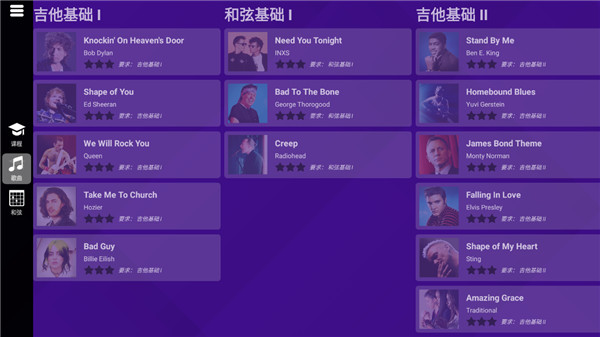 点击歌曲后,海量的歌曲资源可供用户用吉他弹奏。