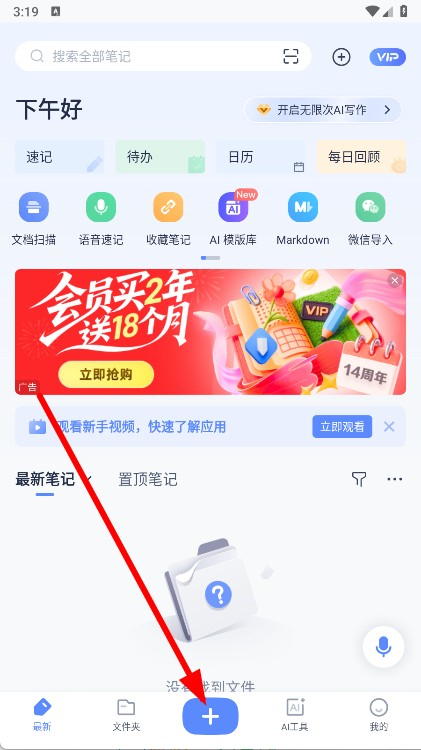 1、打开应用,进入首页后,点击底部中间位置的加号按钮,即可开始创建新的笔记。