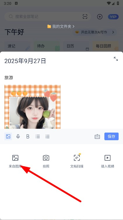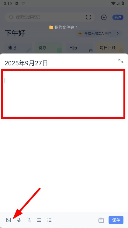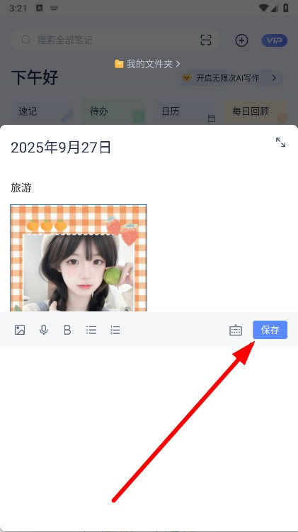 5完成笔记内容的编辑工作后,点击界面右上角的保存按钮,就能把包含图片的笔记成功存储起来。