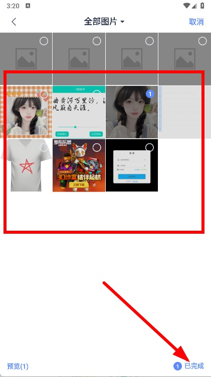 4、在图库内勾选好目标图片后,点击“已完成”按钮,即可完成图片的插入操作。