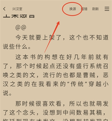 2、确认开始阅读后,在小说阅读页面点击屏幕中央唤起功能列表,接着点击右上角的“换源”选项,就能更换小说的书源地址了。