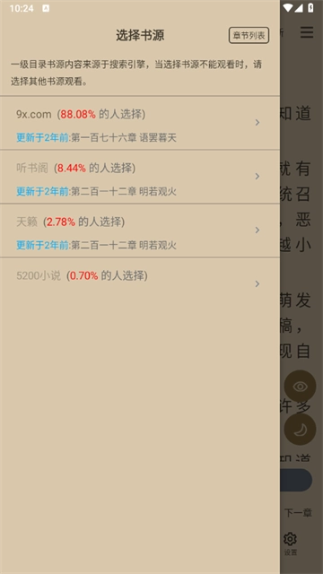3、如此一来,用户只需在选择来源的页面中,找到更新速度快的书源网站,点击它就能完成换源操作,从而获得良好的阅读体验。