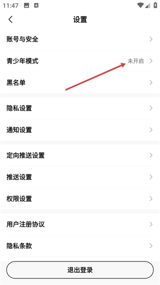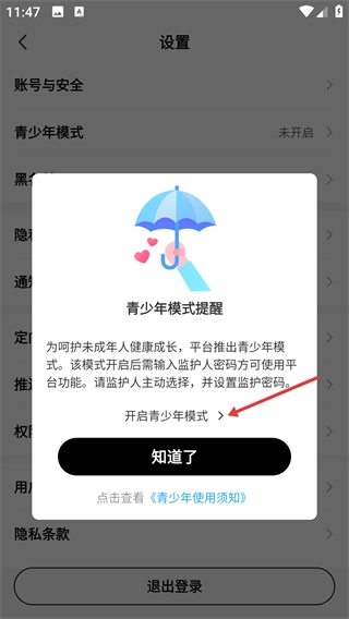 在设置界面中点击【青少年模式】这一选项,系统便会弹出青少年模式的功能提示窗口。