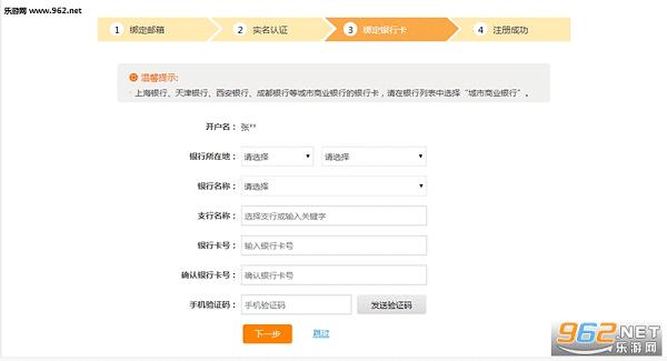 第八步:进入绑定银行卡的页面,按照页面提示填写好相关的银行卡信息,接着点击【发送验证码】按钮;通过短信收到验证码后,将其准确填入对应的输入框,再点击【下一步】按钮即可。
