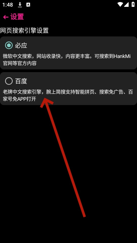 用户可以根据自身需求,从百度、必应搜索等选项中进行选择