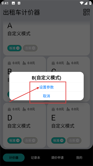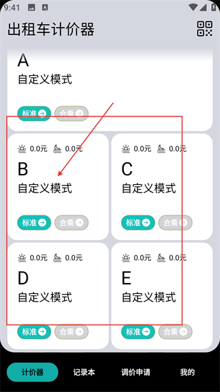 1在出租车计价器的计价页面,能够选择B、C、D、E等自定义模式,每个模式均提供标准、合乘两种计价方式供选择。