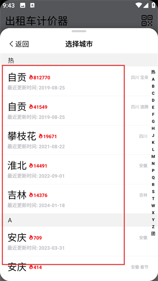 4、在城市选择页面,可选择自贡、攀枝花、淮北、吉林、安庆等城市,每个城市都标注了更新时间,便于用户选择对应城市的计价规则。