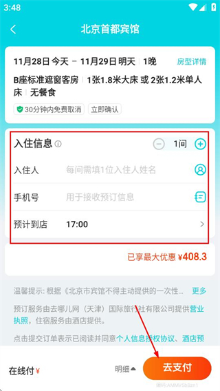 4在酒店详情页选定心仪房型后,点击预订按钮,即可跳转至入住信息填写界面。
