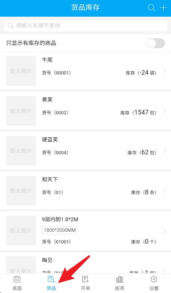 2找到界面下方的“货品”选项并点击,进入到库存明细的展示页面后,就可以看到每一件商品对应的库存数目以及当前所处的状态了。