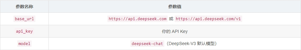 DeepSeek API 采用与 OpenAI 兼容的参数格式,下面是其主要配置信息: