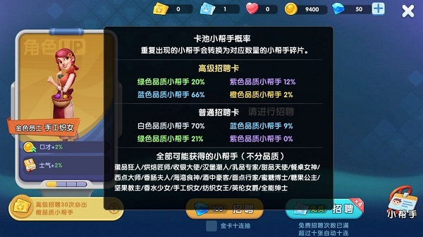 员工能够显著减轻玩家的工作量。招聘方式主要有两种,即钻石招聘与普通招聘,具体的抽卡概率情况如下: