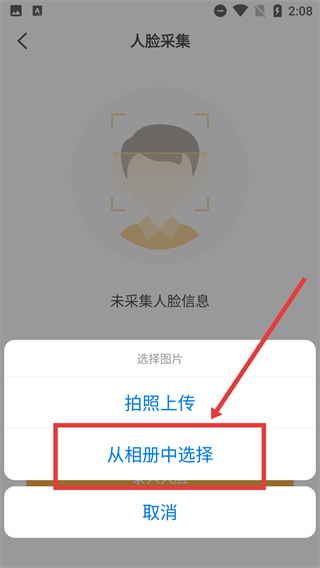 3、在弹出的人脸采集选项弹窗里,点击【从相册中选择】这一选项,即可进入相册的照片选择界面,为选取人脸照片做好准备。