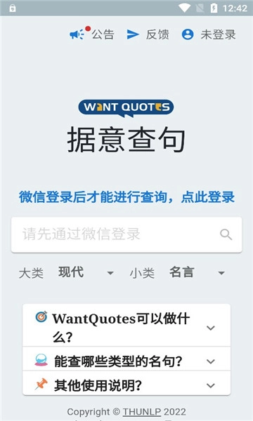 wantquotes 是一款能依据用户描述的意思来查找对应语句的软件。它的整体功能相当不错,对于有这类需求的用户而言,完全可以称得上是神器。目前该软件可查询四个大类、13个小类的内容,后续或许还会增加更多类别。