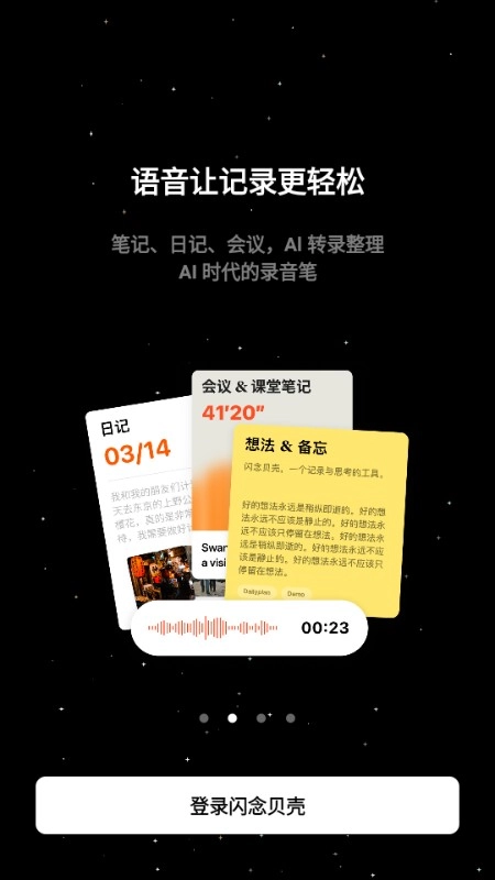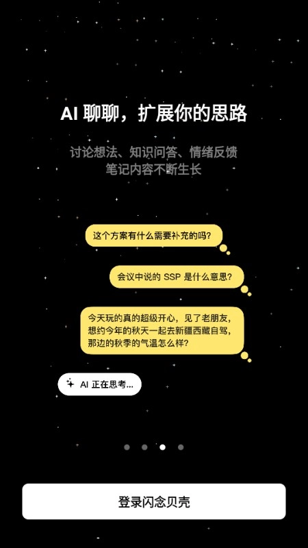 闪念贝壳是一款操作简便却功能强大的AI工具软件。借助这款软件,用户能够智能化地开展各类记录,从而让生活与工作更加便捷。无论是工作时突发的创意构思、待办事项提醒,还是读书时产生的灵感批注,用户都可通过本软件迅速记录下来。此外,软件支持文字、语音、图片等多种记录形式,方便不同习惯的用户找到适合自己的记录方式。