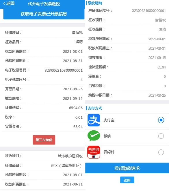 确认信息准确无误后,点击【第三方缴税】选项,接着挑选合适的支付方式完成税款缴纳。