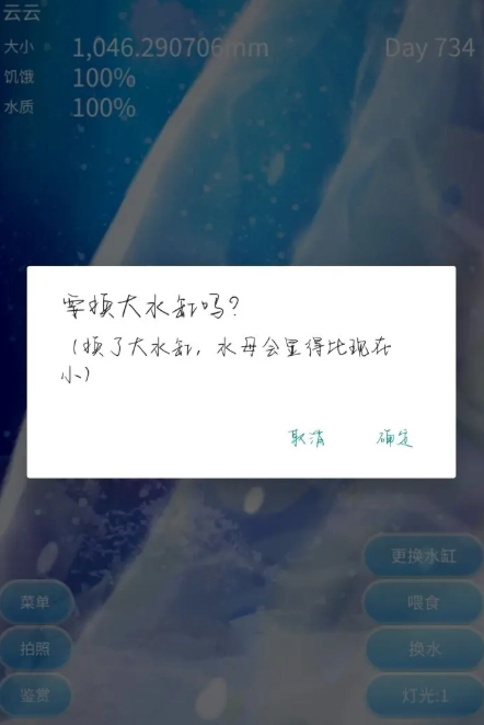 1. 当水母生长到特定阶段时,会出现 “成长啦” 的提示,在这个时候,玩家就可以记录下水母尺寸的变化状况。